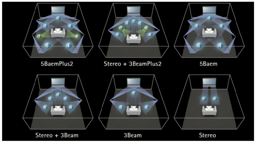 De plus, avec les DSP embarqués par ces projecteurs Sonores, le système joue sur les réflexions pour créer l’espace et la «malléabilité» du système lui permet aussi d’offrir de très nombreux modes de restitution en stéréophonie élargie ou améliorée.