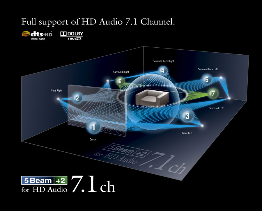 Dans les modèles YSP-4100 et YSP-5100, Yamaha à intégré 7 faisceaux bien réels pour 7 sources virtuelles ; ils sont capables de générer les 7 faisceaux sonores indispensables à la restitution des 7 canaux d’ambiance du 7.1. Bien entendu, cette évolution s’accompagne de l’intégration des derniers décodeurs Haute Définition capables de gérer les formats spécifiques dédiés au 7.1.