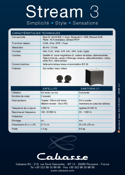 Toutes les infos sur le nouveau Cabasse Stream 3 ! Haute-Fidélité Sans Fil, Nomade et Multiroom by Guillaume - 23 janvier 201320 février 20140 Le nouveau système Cabasse Stream 3 pointe le bout de son caisson… A quoi s’attendre ? Quelles fonctionnalités ? Quel look ? Quelles caractéristiques techniques ? On vous raconte tout, preuves à l’appui ! C’était donc ça la « grosse surprise » qui nous avait été annoncée par Cabasse il y a quelques temps, et que nous relayions dans l’article « Les rumeurs qui font le Buzz ». Pas de casque donc, ni de dock iPhone… Mais on a largement de quoi se consoler avec ce système Cabasse Stream 3 qui s’annonce fort prometteur sur le papier ! Simplicité, style et sensations. Voici les 3 leitmotivs du dernier né de chez Cabasse. En effet, le Stream 3 se veut facile d’emploi, design, et convaincant sur le plan sonore : des qualités que l’on retrouvait déjà sur le Cinéole. Mais avec le Stream 3, le plus célèbre constructeur français ajoute des capacités réseau/multimédia hautement convoitées dans cette ère « numérique » où le streaming et les smartphones/tablettes sont fermement ancrés. Commençons par le look du Stream 3… Si vous avez aimé le Cinéole ou le pack 2.1 Eole 3, alors vous ne serez pas déçu car Cabasse a repris un design rigoureusement identique. Les satellites du Stream 3 n’étant autre que les déjà célèbres Eole 3, équipés du Coaxial à tweeter Soft Dome de 29 mm monté sur un HP de 100 mm à membrane P2C. En ce qui concerne le caisson, aucune surprise non plus, puisqu’on retrouve un Santorin 21 légèrement réétudié (filtrage revu, woofer 210 mm en pulpe de cellulose, BP 29Hz – 150 Hz). L’amplification est contenue dans le caisson, et l’on y découvre un module TSA120WBI de 120 « vrais » Watts. A noter que 80 Watts sont dédiés au caisson, et 2 x 20 Watts aux satellites. Sur la face arrière du caisson, on profite d’un potentiomètre de volume, d’un switch permettant de sélectionner parmi 2 types de mise en veille auto, d’un bornier propriétaire pour la connexion des satellites, et d’un bouton on/off. Les plus habitués de ce genre de ce système auront remarqué l’absence de crossover… Et pour cause : cette fonction est inutile dans la mesure où le filtre est parfaitement accordé au couple caisson/satellites ! Côté connectique, on retrouve une entrée RCA pour la connexion de n’importe quelle source de niveau ligne, et une entrée Optique assurant la prise en charge des sources numériques. Ah oui, puisqu’on parle de numérique… Ce Stream 3 adopte un circuit de conversion 24Bits/96kHz, ce qui est à l’heure actuelle amplement suffisant (pour rappel, un CD est échantillonné en 44,1kHz sur 16 bits). En fait, la vraie nouveauté de ce système 2.1 Cabasse Stream 3 réside dans ses capacités réseau/multimédia, elles-mêmes appuyées par un module Wi-Fi et une prise Ethernet. En plus d’être compatible DLNA (lecture des fichiers audio stockés sur un ordinateur ou un appareil compatible connecté au réseau), il assure une diffusion audio sans-fil via Bluetooth (streaming depuis n’importe quel smartphone/tablette/ordinateur doté du bluetooth 2.1), un accès aux radios web (des milliers dans le monde entier), ainsi qu’une prise en charge des protocoles uPnP et WPS. La compatibilité avec les différents formats de fichiers audio est également très appréciable, puisqu’on retrouve aux côtés des très connus MP3, WMA et FLAC, les plus discrets AIFF, WAV ou AAC. Le Dolby Digital est également de la partie. Enfin, pour piloter tout cela, le facteur de Mirecourt met à disposition une télécommande très design, et une application pour smartphones iOS/Android à la pointe du bon goût. Un sans faute. Avec un prix de 999€, des fonctionnalités dans l’air du temps, une esthétique très classe, et une sonorité dans la lignée des systèmes Cabasse, ce Stream 3 ne pas passera pas inaperçu ! D’autant qu’il est livré avec tous les accessoires nécessaires à sa connexion, dès la sortie de la boîte (câbles RCA et Optique, socles pour satellites, câbles d’enceintes, télécommande, cordon d’alimentation, notice…). Bien vu M’sieur Cabasse ! Le pack 2.1 Cabasse Stream 3 est proposé en finition Noire Laquée ou Blanche Laquée. Présentation vidéo officielle du pack 2.1 Cabasse Stream 3 : Galerie de visuels du Cabasse Stream 3 :